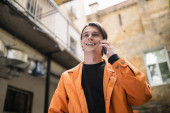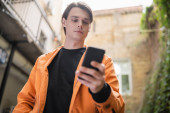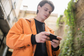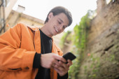 Niski kąt widzenia uśmiechnięta Azjatka w płaszczu Trench za pomocą smartfona na zewnątrz