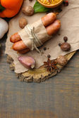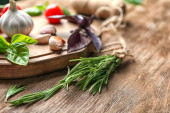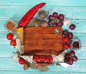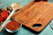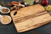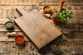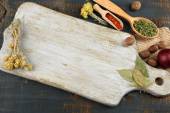Różnych przypraw i ziół z deska do krojenia na kolor drewniany stół tło