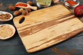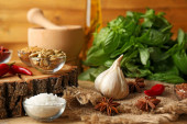 Zdjęcie "Różnych przypraw i ziół z deska do krojenia na kolor drewniany stół tło" może być wykorzystywane do celów osobistych i komercyjnych zgodnie z warunkami zakupionej licencji Royalty-free. Obraz jest dostępny do pobrania w jakości wysokiej rozdzielczości do 5760x3840.