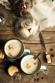 Piękna kompozycja z pyszne cappuccino na drewnianym stole