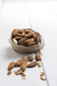 migdały w misce na tło ziarniste drewna