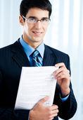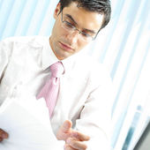 portret uśmiechający się biznesmen pisanie pracy w biurze
