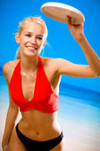 młody piękny uśmiechający się blond kobieta z mlecznego w bikini