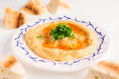 Świeży hummus z natką pietruszki i oleju.