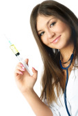młody szczęśliwy uśmiechający się kobiece kobieta lekarz, na białym tle