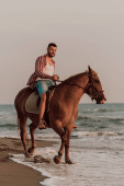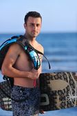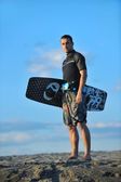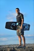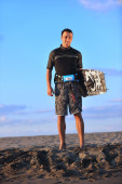 portret mężczyzny młodych kitsurf na plaży przy zachodzie słońca