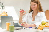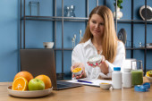 Atrakcyjny kobiecy dietetyk prowadzący konsultacje online z pacjentem. Zdrowa żywność, zdrowy tryb życia.