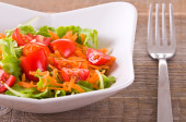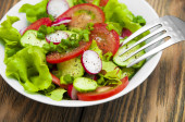 Świeże ryby sałatka z warzyw na talerzu na drewniany stół szczegół