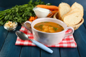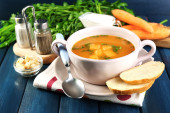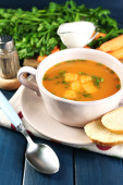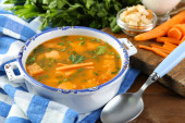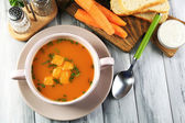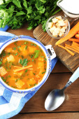 Zupa z marchwi, krem i łyżka, na tle drewniane kolor
