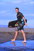 portret mężczyzny młodych kitsurf na plaży przy zachodzie słońca
