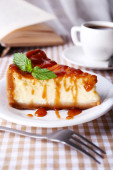 Sernik z cukru proszek na papierze na drewnianym stole na tle ściany drewniane