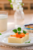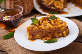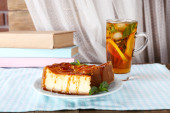 Sernik w płytkę i ziołowe herbaty w serwetkę na tle kurtyny