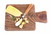 Kawałek sera parmezan na deski do krojenia drewniana z serwetka na białym tle