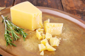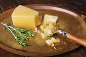 Ser parmezan z gałązką rozmarynu na tabliczce na drewnianym stole tło