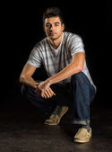 Uśmiechnięty mężczyzna przystojny bródką gospodarstwa zwiędły Rose