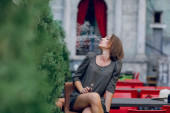 młoda kobieta w zimowym swetrze i okularach przeciwsłonecznych paląca e-papierosa stojąc z torebką na miejskiej ulicy