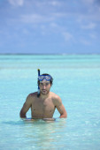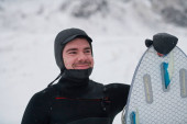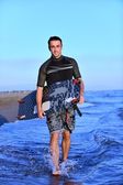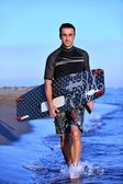 portret mężczyzny młodych kitsurf na plaży przy zachodzie słońca