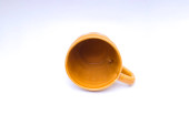 Dwa białe kubki na niebieskim tle. Biały kubek emaliowany, kubek ze stali nierdzewnej, kubek kempingowy.