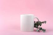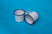 Dwa białe kubki z liściem paproci na niebieskim tle. Biały kubek emaliowany, kubek ze stali nierdzewnej, kubek kempingowy.
