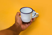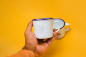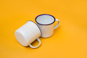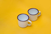 Zdjęcie "Dwa białe kubki z liściem paproci na niebieskim tle. Biały kubek emaliowany, kubek ze stali nierdzewnej, kubek kempingowy." może być wykorzystywane do celów osobistych i komercyjnych zgodnie z warunkami zakupionej licencji Royalty-free. Obraz jest dostępny do pobrania w jakości wysokiej rozdzielczości do 5760x3840.