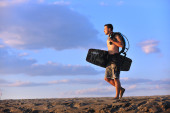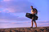 portret mężczyzny młodych kitsurf na plaży przy zachodzie słońca