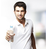 młody szczęśliwy uśmiechający się człowiek z butelka wody na zewnątrz
