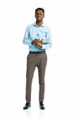 Szczęśliwy Afryki amerykański student stojący z książek Witam