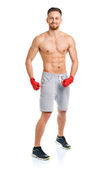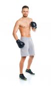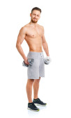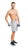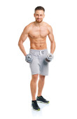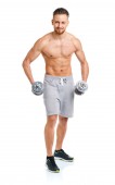 Lekkoatletycznego mężczyzna z hantlami na biały