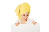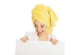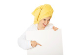 Zdjęcie "Kobieta w szlafrok trzymając pusty transparent" może być wykorzystywane do celów osobistych i komercyjnych zgodnie z warunkami zakupionej licencji Royalty-free. Obraz jest dostępny do pobrania w jakości wysokiej rozdzielczości do 5760x3840.