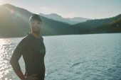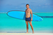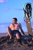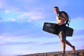 portret mężczyzny młodych kitsurf na plaży przy zachodzie słońca