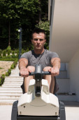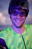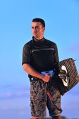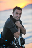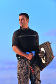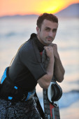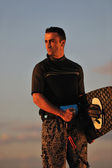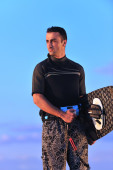 portret mężczyzny młodych kitsurf na plaży przy zachodzie słońca