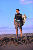 portret mężczyzny młodych kitsurf na plaży przy zachodzie słońca