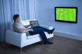 Zdjęcie "Człowiek oglądać mecz piłki nożnej" może być wykorzystywane do celów osobistych i komercyjnych zgodnie z warunkami zakupionej licencji Royalty-free. Obraz jest dostępny do pobrania w jakości wysokiej rozdzielczości do 5760x3840.
