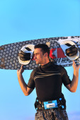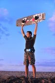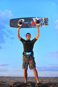 portret mężczyzny młodych kitsurf na plaży przy zachodzie słońca