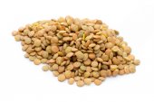 kupie zielonej soczewicy z niskiej perspektywy na białym tle.