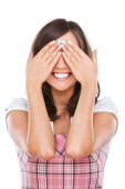 Kobieta interesu wskazując i potajemnie śmiejąc się