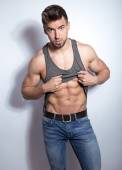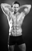 Przystojny młody kulturysta pokazano jego dopasowanie ciała i mięśni