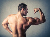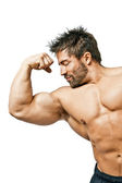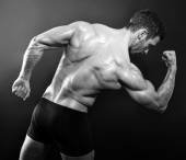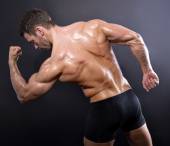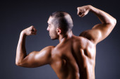 Przystojny młody kulturysta pokazano jego dopasowanie ciała i mięśni