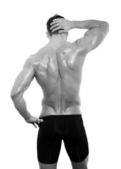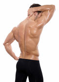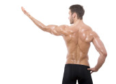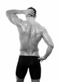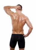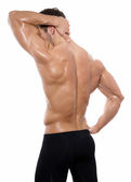 Przystojny młody kulturysta z doskonałą i dopasowanie do ciała wykazujące poza jego mięśnie na na białym tle