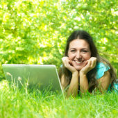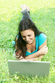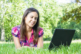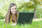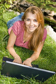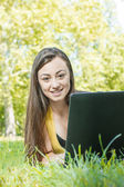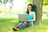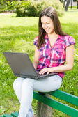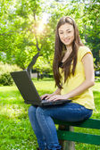 Szczęśliwa młoda kobieta za pomocą laptopa na zewnątrz