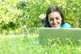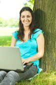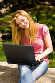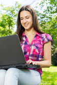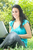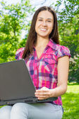 Szczęśliwa młoda kobieta za pomocą laptopa na zewnątrz