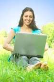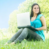 Szczęśliwa młoda kobieta za pomocą laptopa na zewnątrz