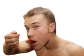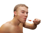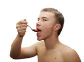młody człowiek jedzenie kawior czerwony