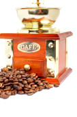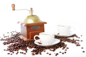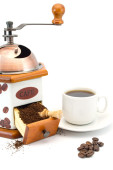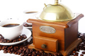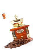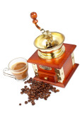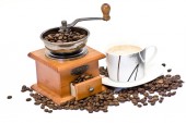 Puchar, szlifierka, dzbanek do kawy i fasoli