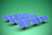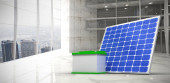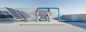 3d rendering of photovoltaic cell on solar panel, condenser unit or compressor on rooftop. Eco building with system technology for future. To generate electrical power or direct current electricity.