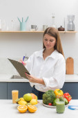 Szczęśliwa młoda kobieta trzyma zielone jabłko w ręku w kuchni. Koncepcja zdrowego odżywiania, wegetarianizmu.