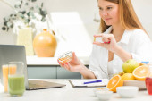Zdjęcie "Szczęśliwa młoda kobieta trzyma zielone jabłko w ręku w kuchni. Koncepcja zdrowego odżywiania, wegetarianizmu." może być wykorzystywane do celów osobistych i komercyjnych zgodnie z warunkami zakupionej licencji Royalty-free. Obraz jest dostępny do pobrania w jakości wysokiej rozdzielczości do 5760x3840.