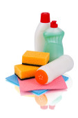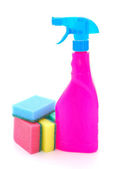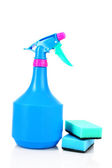 butelka z rozpylaczem detergentu, gąbki i rękawice