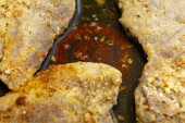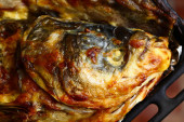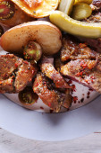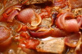 Półmisek filet z pangi z cebulą i pomidorami koktajlowymi na tle patelni spalić