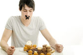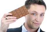 szczęśliwy człowiek, jedzenie pyszne czekolady i mając trochę cukru dzień